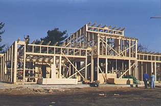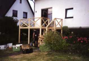 Balkon, natürlich auch aus Lärche. Der Dielenbelag ist wasserdicht konstruiert, was erstens den Eingang darunter trocken hält und zweitens die wertvolle Tragkonstruktion schützt.